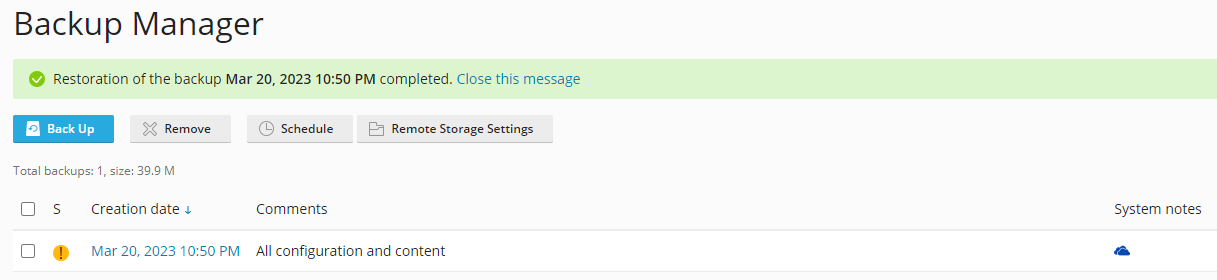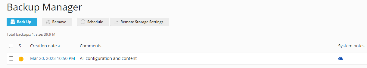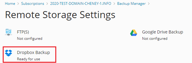 2) Once a backup has run, you can check the status from the Backup Manager. You should also see an accompanying .tar file created in your Dropbox account under the path that was specified during configuration: