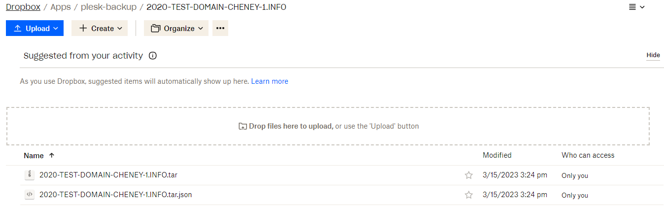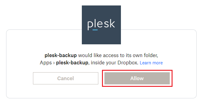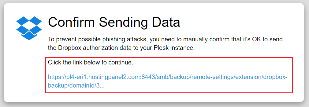 You will also be prompted to confirm the data transfer between Plesk and Dropbox (click the link provided to continue):
