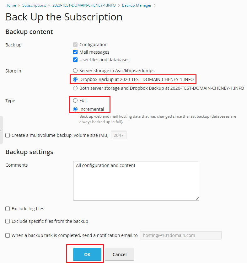 Back-Up → Performs a "one-time" backup of the subscription. At a minimum, you will need to select the Type of backup (either Full or Incremental). The are other options that can be customized if desired. Hit OK to start the backup process: