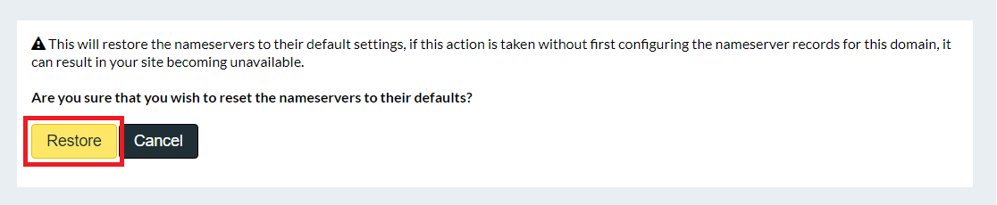 Restoring your domain to the default name servers will overwrite any custom DNS settings. If you have not configured the necessary DNS records beforehand, your website or services may become unavailable.