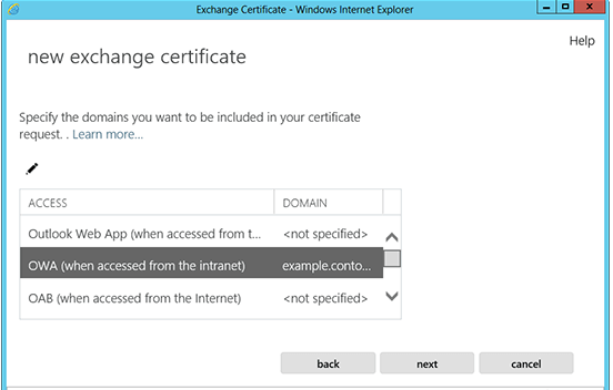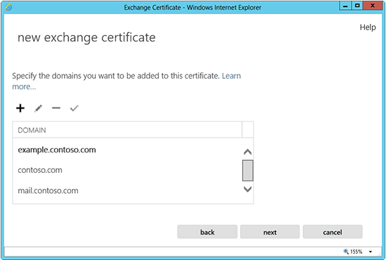 Review the list of names that Exchange 2013 recommends using in your CSR and click Next. You can add, edit, or delete the names by using the +, – features provided.