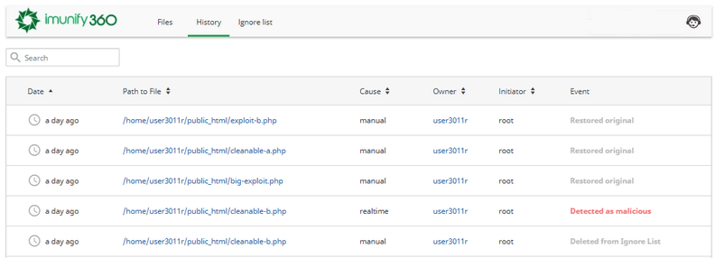 Deleted from Ignore List — the file was removed from Ignore List. Imunify360 will scan it.