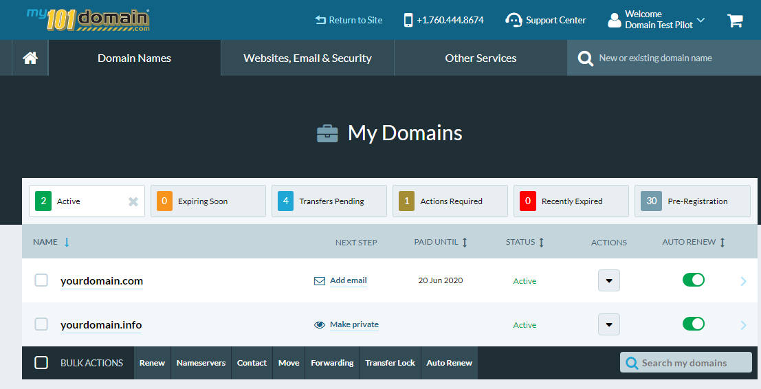 To ensure smooth operation of your domain name renewals, it is highly recommended you set all of your domain names to auto-renew.