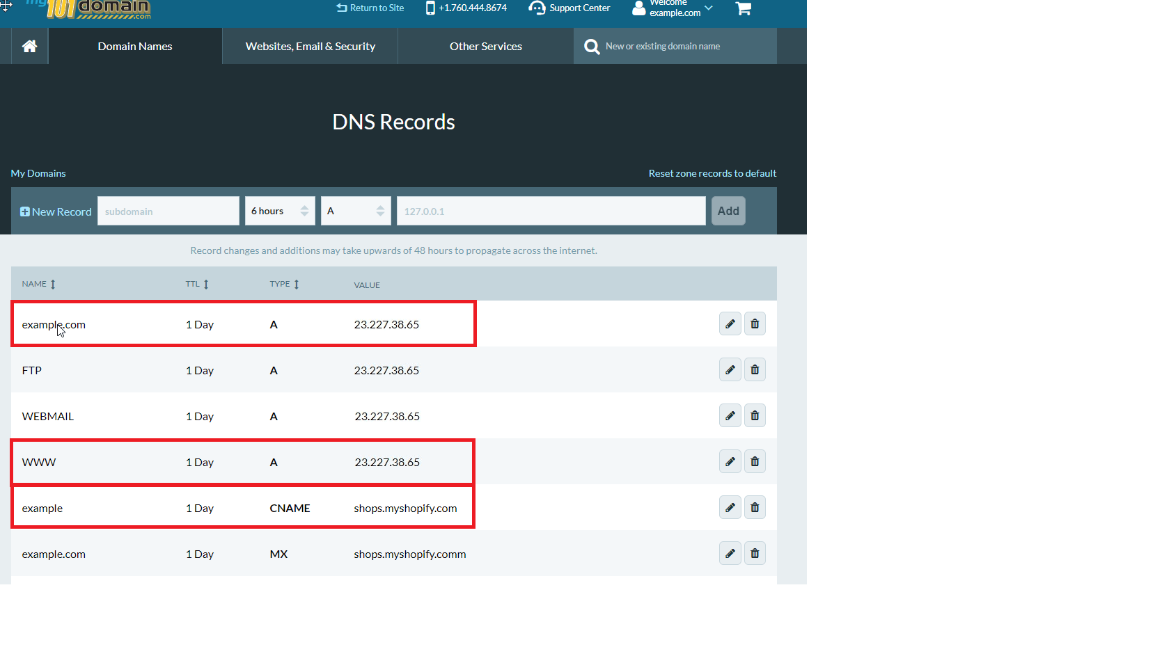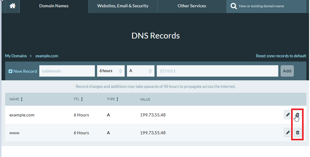 Delete the existing A records for the root domain and the WWW using the trash icon next to each record.