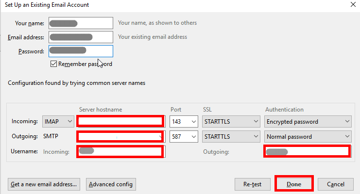 Enter your mail server hostname for incoming and outgoing servers. Enter your email address for incoming and outgoing Username and then click Done.