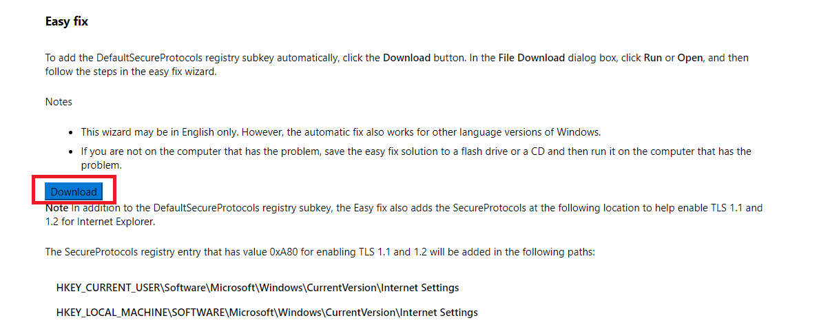 Visit the following URL: https://support.microsoft.com/en-us/help/3140245/update-to-enable-tls-1-1-and-tls-1-2-as-default-secure-protocols-in-wiScroll down towards the bottom and click on the blue Download button under "Easy fix".
