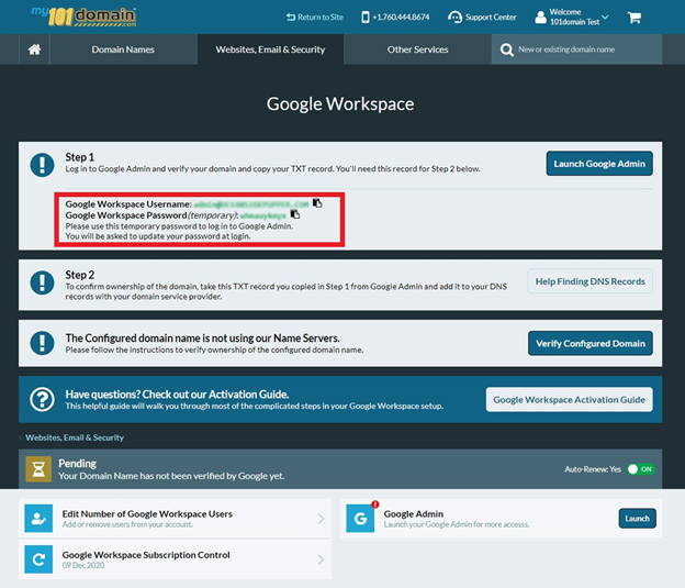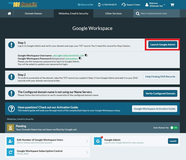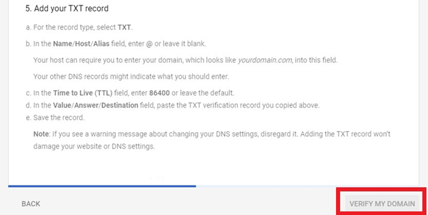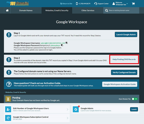 To finish verifying your domain, follow the instructions to add the TXT record to your domain host. If you need help, you can click on the Help Finding DNS Record button next to step 2 in your 101domain Google Workspace Dashboard