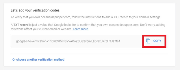 If asked to choose a verification method, select Create a TXT record, and Continue